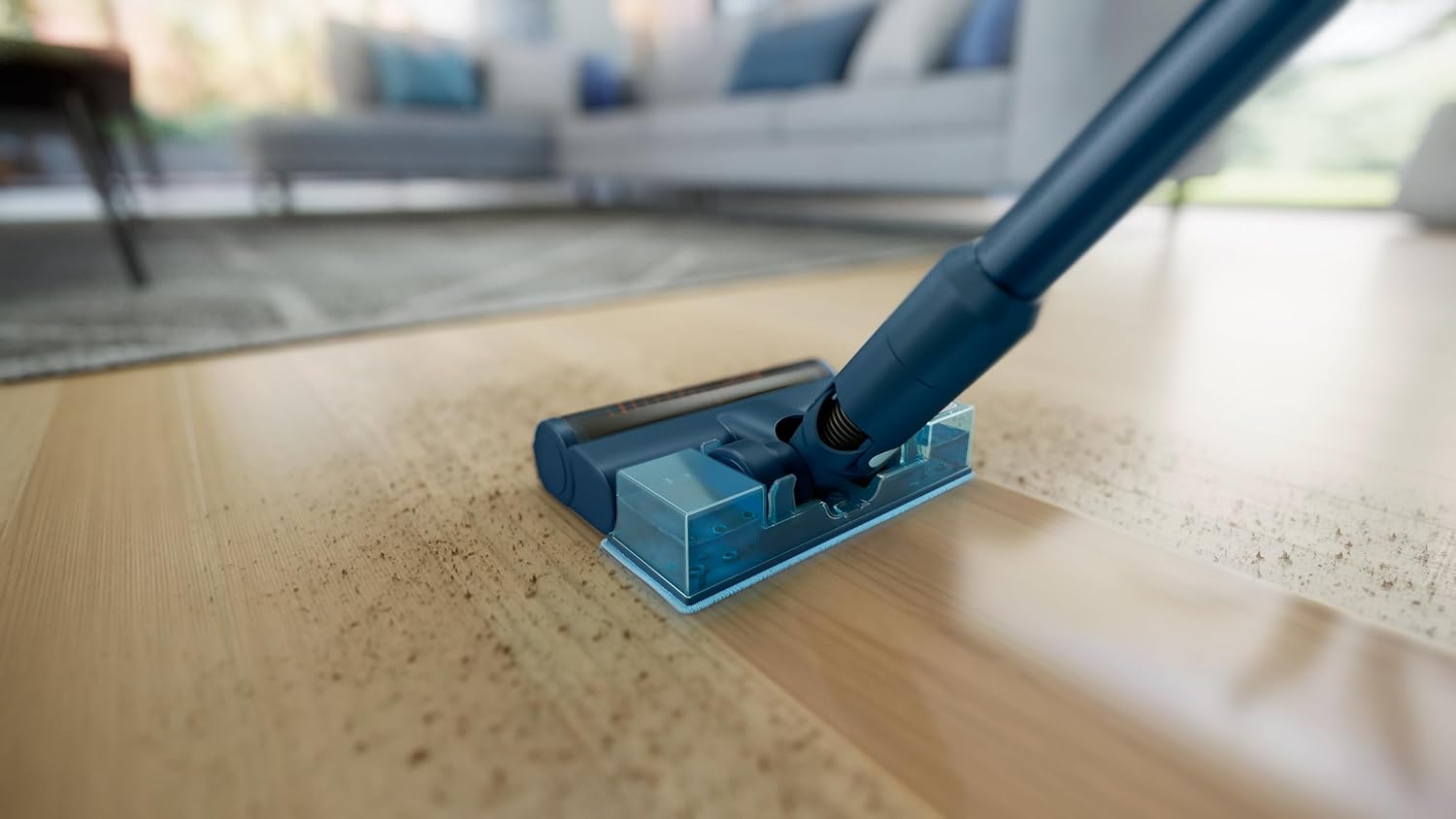 جارو شارژی فیلیپس مدل XC5041 به لطف داشتن یک مخزن آب در قسمت عقب پارویی توانایی شستن کف و از بین بردن لکه ها را نیز دارد. این مخزن در قسمت زیرین دارای یک پد نخی است که به مرور از آب مخزن مرطوب می شود و همزمان که کف را جارو می کند یک تی مرطوب نیز برای شما میزند. شما در هنگام جارو کردن فرش نیازی به این پد ندارید. همچنین داخل جعبه یک پد اضافه نیز قرار دارد.